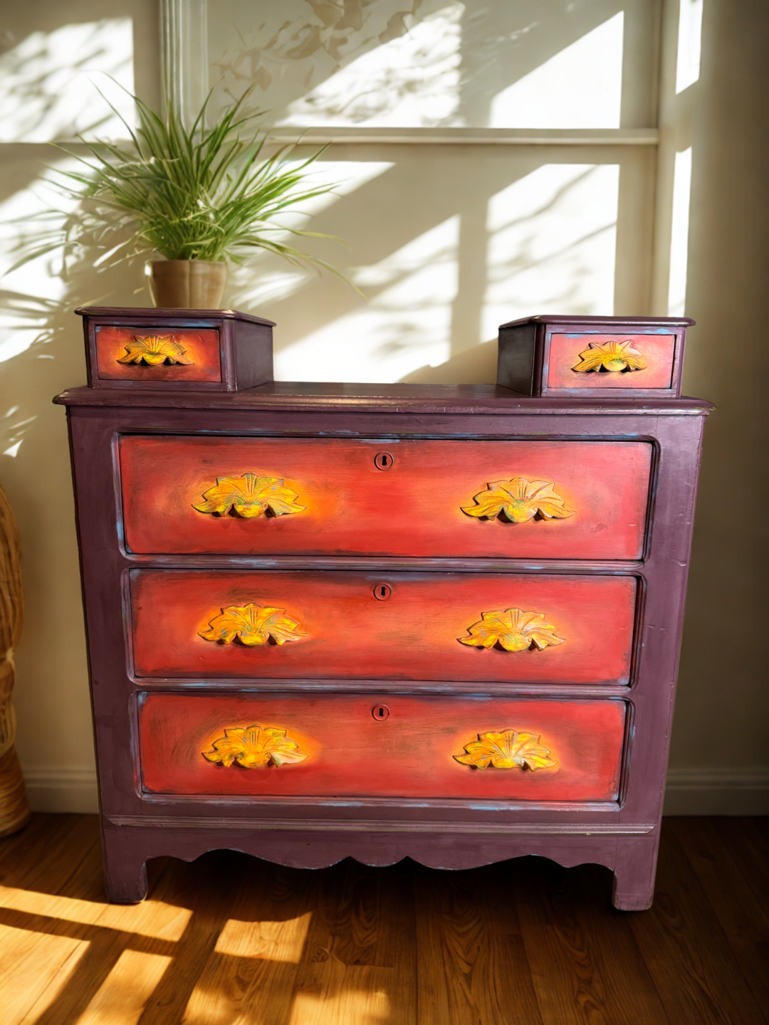 Bring the warmth of autumn into your home with this hand-painted vintage dresser.  Each drawer is finished in rich harvest reds and glowing amber tones, highlighted by carved golden leaf pulls that radiate like fall sunshine.  Delicate leaf accents along the sides add depth and artistry, making this dresser a true statement piece.