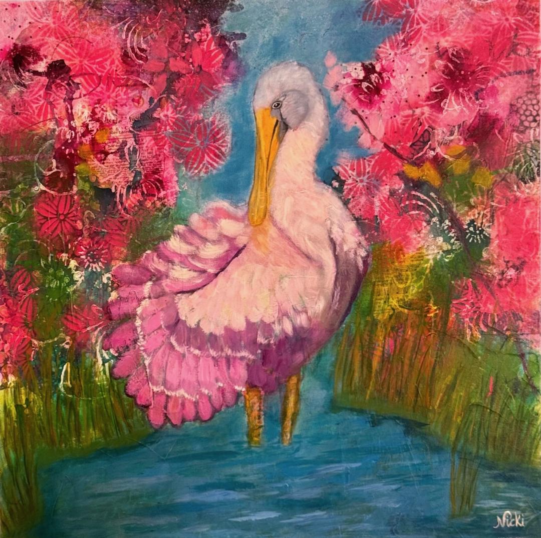 Grace Comes in the Morning is an original mixed-media painting celebrating renewal, serenity and the quiet strength found in nature. A soft, elegant bird stands poised in tranquil blue water, surrounded by vibrant pink blooms and lush greenery. Layered mark-making, textured patterns, and luminous color washes create a dreamy, uplifting atmosphere.